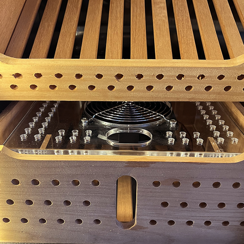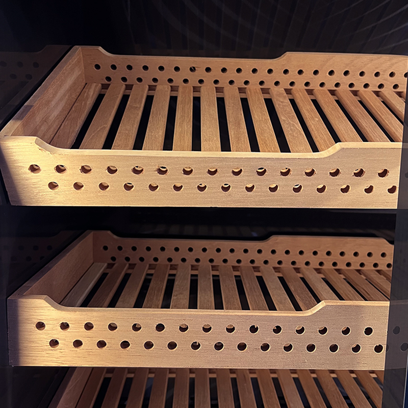 The frameless glass door of this electric cigar humidor adds a modern, high-end touch, blending seamlessly with its onsite space. Inside, the adjustable cigar display shelves allow for both horizontal and angled cigar placement, making it ideal for both storage and display in cigar retail stores. The shelves are crafted from premium Spanish cedar imported from Peru, which naturally repels insects, prevents mold, and maintains humidity for optimal cigar preservation.