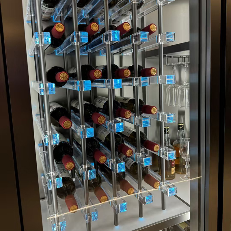 This custom wine cabinet is built into the wall, giving it a clean, space-saving appearance. The stainless steel frame ensures long-term durability, while the interior is crafted with a mix of premium materials such as oak wood, stainless steel, and acrylic. This combination delivers both visual appeal and practical performance.