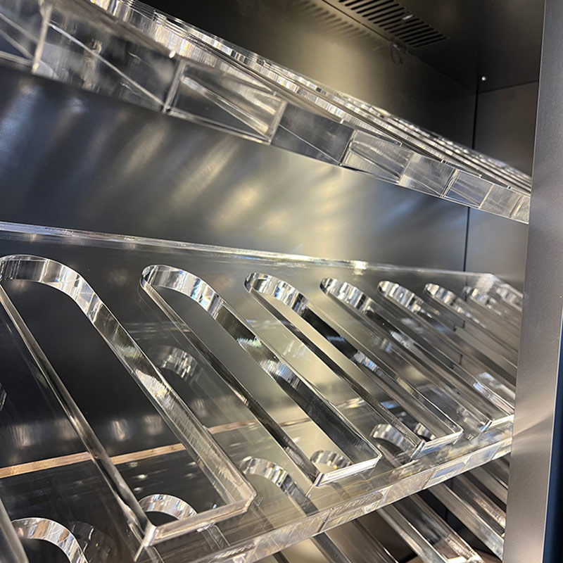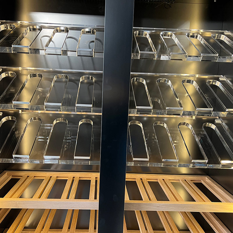 For a luxurious wine cellar cabinet, the use of acrylic wine racks can usually bring further aesthetic sublimation to the entire wine cabinet. At the same time, the shape of acrylic can also be adjusted according to the internal shelves to better match the overall aesthetics.