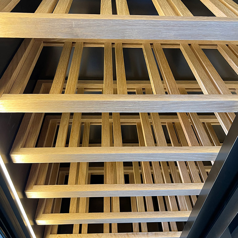 For the internal shelves of this wine refrigerator cabinet, the customer boldly chose acrylic as the oblique display shelf. The bottom is made of conventional beech shelves. With the internal lighting, the precious wine collection on the upper layer can be displayed to friends and customers.