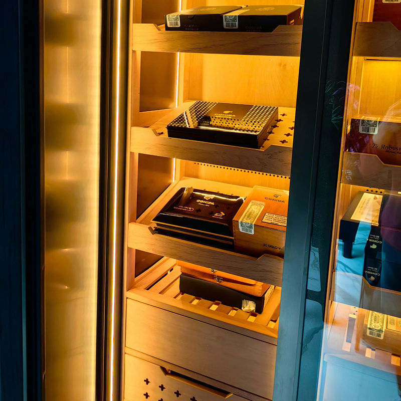 - Spanish Cedar Shelving – Enhances cigar aging and prevents mold.