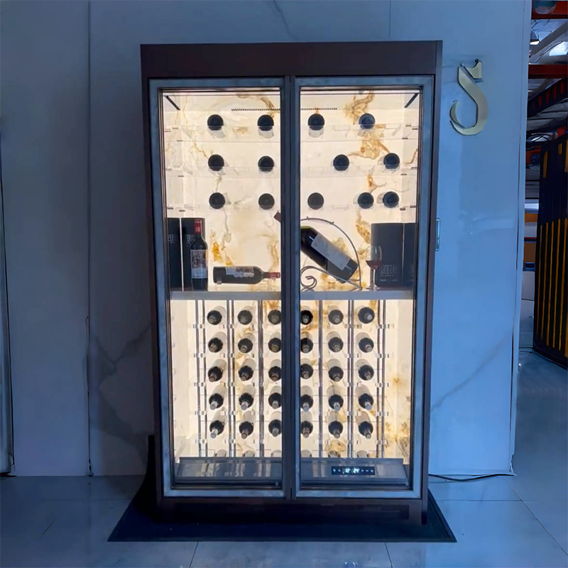Inside the modern wine display cabinet, a backlit translucent marble panel serves as the visual centerpiece. The soft lighting shines through the marble, creating a luxurious and glowing effect. It not only enhances the overall visual impact but also highlights the wine bottles in a soft, ambient light. This makes the cabinet ideal for upscale wine shops, restaurants, bars, or private wine cellars.
