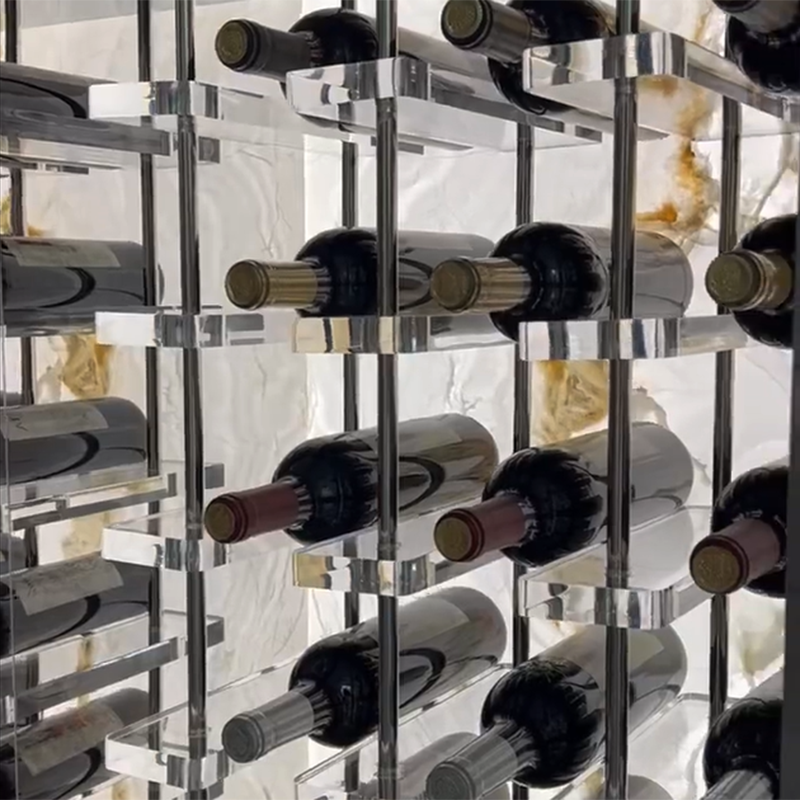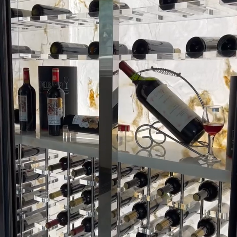 The shelving is made from crystal-clear acrylic. These transparent layers give the entire wine cabinet for display a light and open feel. They provide excellent visibility from all angles, making each bottle easy to view and access. Acrylic shelves are strong, lightweight, and resistant to moisture — a smart and stylish choice for wine storage.