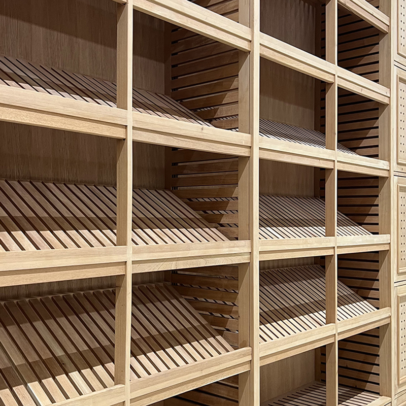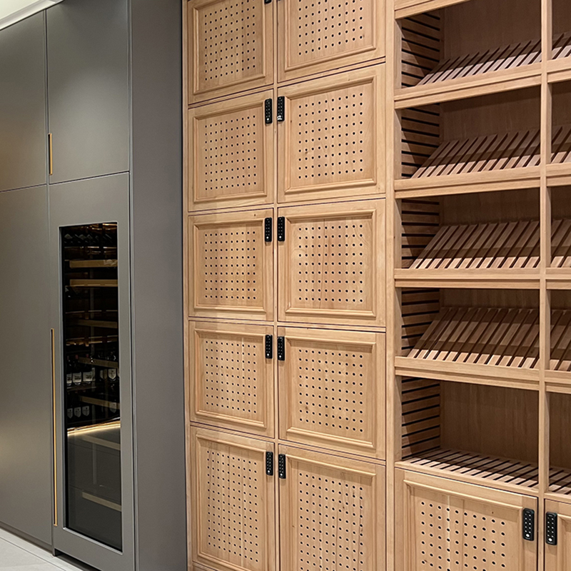 The natural wood finish adds sophistication to any space. Customers can customize materials, colors, and finishes to match their cigar lounge or private room.